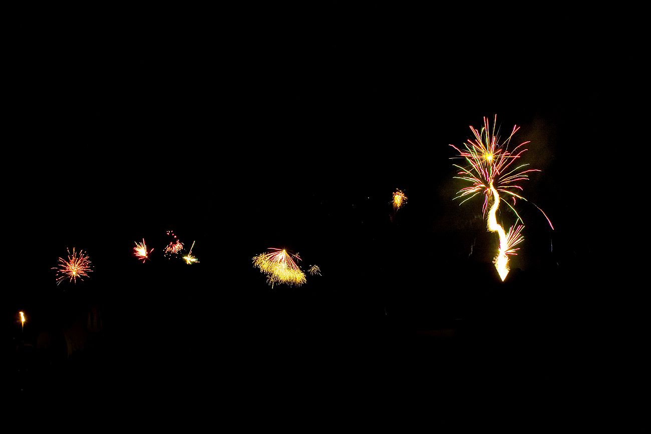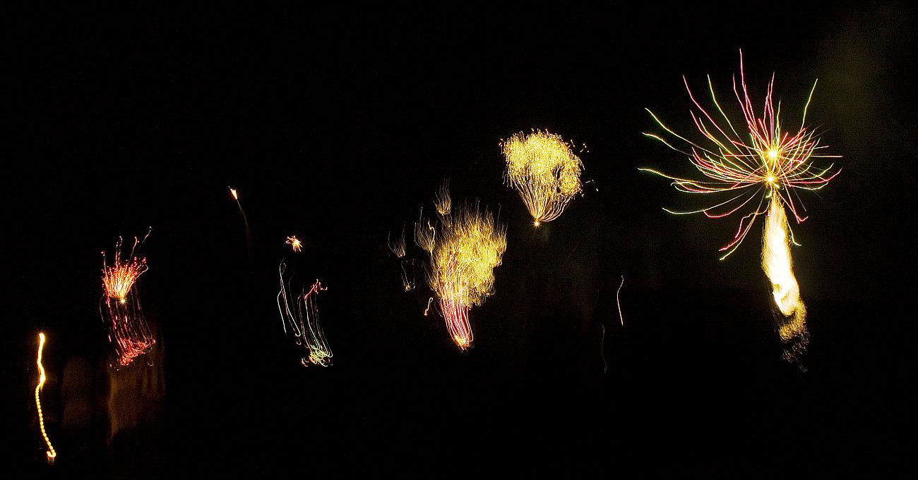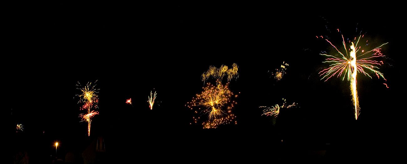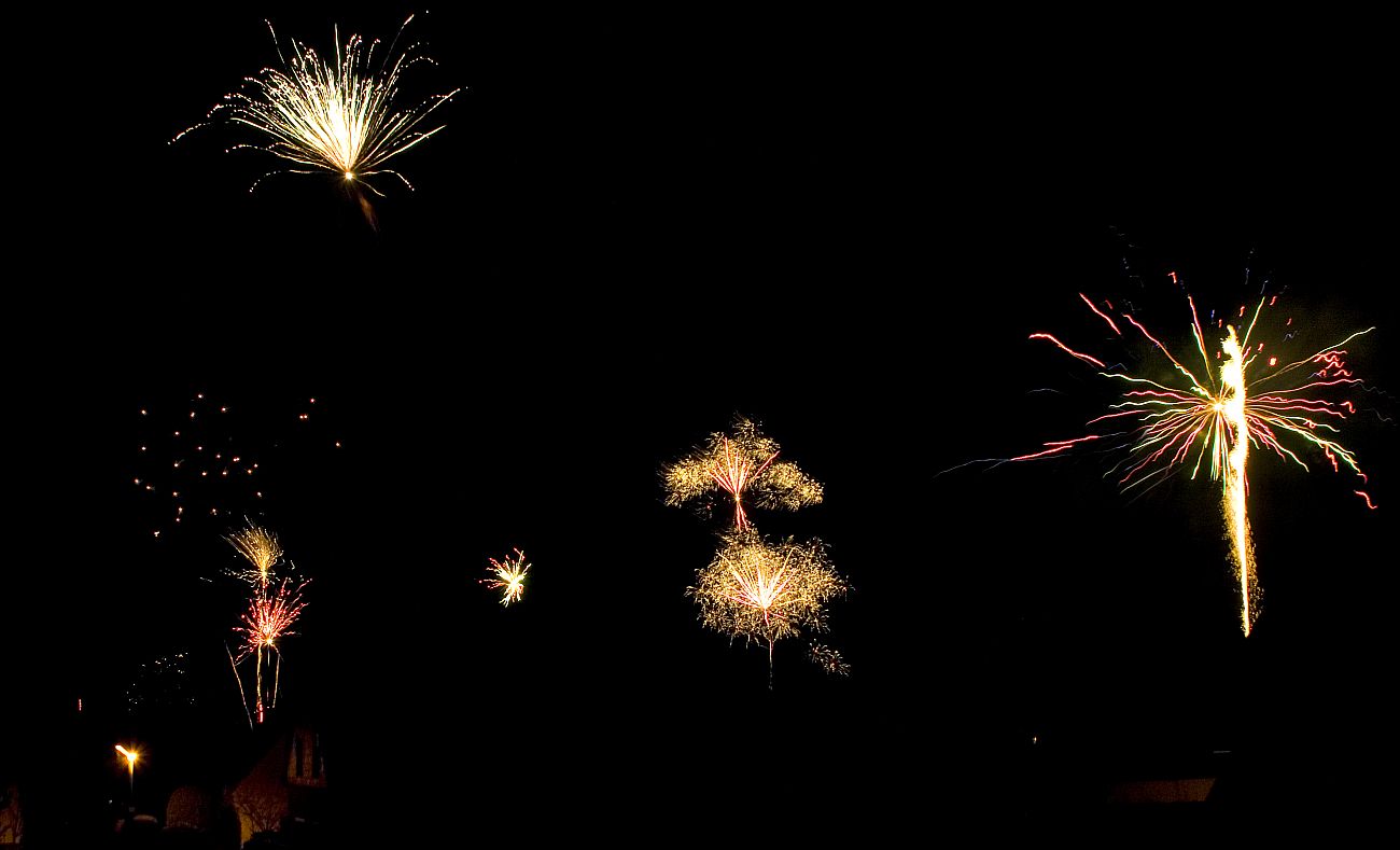 Zugegeben, zwei der Raketen habe ich später fotografiert und in diesem Bild eingefügt. Dabei kam mir der Gedanke, dass es doch cool wäre, wenn man sich mit seinen Nachbarn abspricht. Ich könnte mir vorstellen, dass gerade in kleinen Dörfern das Gesamtbild des Himmels dann richtig klasse aussehen würde. Dazu würde es ja schon reichen, wenn einer "JETZT" rufen würde und dann 3-4 Leute gleichzeitig ihre Raketen abschießen würden. Habt ihr das schon mal so gemacht? :-)