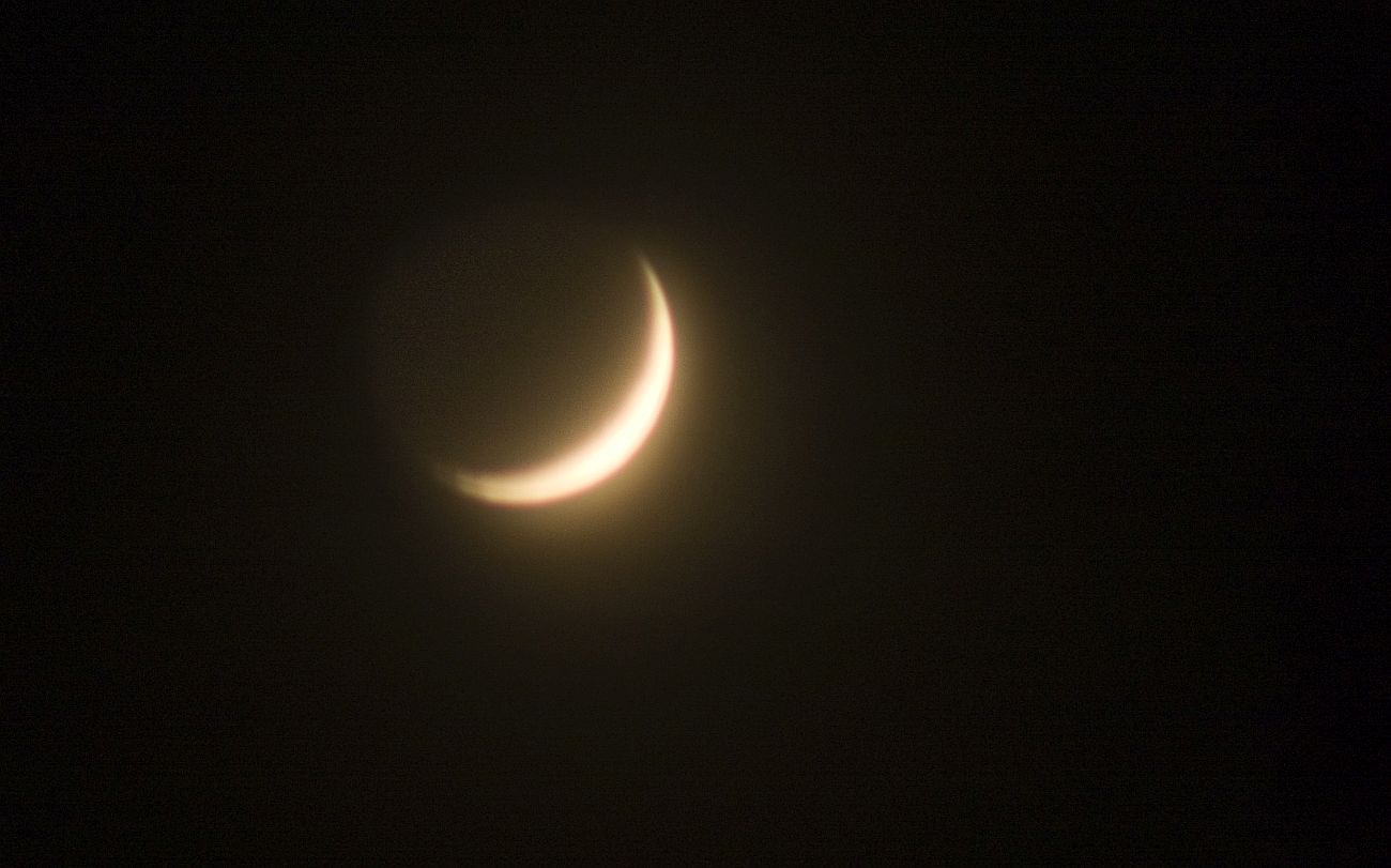 Wenn man schon mal Polarlichter fotografiert, kann man auch gleich den Mond fotogrfieren. Vor allem, wenn er gerade hinter ein bißchen Nebel verschwindet.